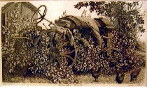 Grace Arnold Albee’s “Entangled Tractor,” from 1945, as well as influential artists’ artist Marshall Glasier’s “Fantastic Landscape” together with the more visionary Charles Ephraim Burchfield’s loopy watercolor and charcoal “Purple Vetch and Buttercups” (aargh, this one’s a period piece) belies the terms “realism” and “landscape” and reinforces the limitless ability of imagination (Albee’s tractor wood engraving, above left, and Glasier’s pen and ink landscape, right).