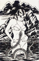 Contemporary Strategies includes the terrific Charles Burns at the top of the post, two flip books from Richard Tuttle that are anything by flip and my fave, an outrageous Kara Walker printed silhouette, “African/American,” a recent purchase, which talks to a 1910 proper silhouette portrait of “William Merritt Chase” by Kate P. Parker nearby. Walker’s bush-woman commentary on racial and sexual stereotypes, positioned just a few feet away from all those traditional nudes in poses of simpering false modesty serves as a nice reaffirmation that contemporary art is not about preserving tradition any more than it’s about rejecting it. That’s a false dichotomy. It’s about transforming tradition so it says something fresh, important and pertinent in a way that’s new. In art, like in all communication, the medium is the message(left, “African/American,” 1998, linocut, 46 x 60 1/2 inches, printer’s proof from edition of 60).