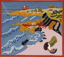 In some ways, this painting, with its patterns and designs, is more like the Kate Abercrombie print from the Philadelphia Print Collaborative than like any of the landscapes in the show (left, Davis’s gouache “Sand Cove,” and right, Abercrombie’s untitled mixed media print; Abercrombie shows at Vox Populi).