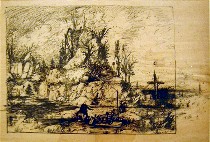 Well, at this point, even with the checklist of works, I’ve lost my sense of categories. So let me just say I loved Janet E. Turner’s “Black Vultures” linocut and Stuart Homer Frost’s “The Tree House” pen-and-ink, which both stopped me dead in my tracks. (Maybe these are visionary landscapes, a category I cannot find on my checklist). I don’t know if Paul Santoleri (now showing at Projects Gallery until July 31) is familiar with Frost, but they have a lot in common with eachother as well as with MC Escher in their approach to the spatial (right, “The Tree House”).