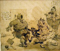 The urban views included a terrific political cartoon from Herbert Johnson, “Yes, These Gangster Assaults on Helpless Babes Should Make Us Real Cross,” made for the Saturday Evening Post ca. 1930-44. Cozzolino, whom we had lost for a while, turned up as we gazed at the Johnson. “I’d love to do a Herbert Johnson show,” he mentioned. He admitted to having lists of shows he was dreaming of based on his explore of the deep deep archives (left, Johnson’s cartoon).