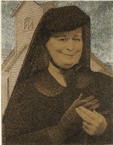 Nearby, an outstanding Grant Wood, “The Good Influence,” is a portrait of the town gossip in the book “Main Street,” for which Wood did a series of drawings. The subject is painted with a wicked twinkle in her eye, in the background a church that looks a lot like the one in Wood’s “American Gothic.” The funny juxtaposition of the holy and unholy zings along with the stylized graphic punch and cartoony portraiture that also make “American Gothic” such an icon (left, “The Good Influence,” black carbon pencil, India ink and white gouache, about 31 x 24 inches).
