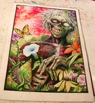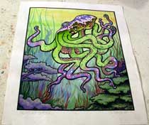 Parker’s work is all hand drawn, no Photoshop involvement. The materials he uses are watercolor, graphite, gouache and “Pro white” (a kind of better, easier to handle White Out pen, he said). He works the pieces over long periods of time and showed me several things that had been started a while ago and would be finished some day.