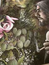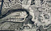 Last week Oona had us over for dinner and showed us a new work, a hand-made poster whose central image is a big ape. The piece is by her friend Dave Parker. The ballpoint pen production, which must have been 24″ by 36″ was made over the course of many months, with Parker working on it while he was visiting friends and socializing. It has references to their entire social circle, all in symbols coded so the insiders know what’s what but nobody really “portrayed” in out and out portraiture. It’s teen notebook art but ambitious and extremely well done and I didn’t have my camera with me. Darn. (top image is a detail of a Parker self portrait and right is a work in progress. Parker said he’s still thinking about working on that red sky in the background.)