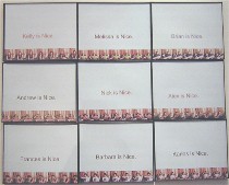 Photographer Ellie Brown’s “Nice” (right) is the funniest piece in the show. Each box in a grid of nine photographs says someone is nice–for instance, “Andrew is nice” or “Kelly is nice.” Below the message is a band of repeated, tiny photo portraits, presumably of the named person. Suddenly, thanks to Friendster and its endorsements of friends, junior high school fate books and multiple wallet-sized portrait exchanges at graduation have multiplied into a manufactured kaleidoscope of relationships. We’re deep in cyberspace where friendship has become metastatic and wide publication forces us into insincerity. It’s scary. But it’s also funny. This piece puts that minimalist grid to good use, manufacturing friendship with tongue firmly and appropriately in cheek. This is by far my favorite piece from Brown. She also has work up at Afif (see post) and at Tower Gallery in Northern Liberties.