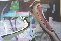 The work comes mostly from young people who came of age when 9/11 changed the world. The imagery is mostly dark, with a smiley face painted on top. So Jason Loebs’ juicy paintwork and stretched, distorted comic figures live in a pixillated world with unclear parameters and no solid earth underfoot (right, Untitled 1, 53 x 36 inches).