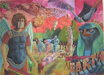 It’s mostly the men in the show who go the comic narrative route, like Loebs. The somewhat incoherent landscape in Walter Benjamin Smith II’s ambitious “Greetings from Earth” (left, 40 x 60 inches), looks like a series of layered stage flats beneath toxic skies. There’s some comic-book composition in the interplay of large and small scale and in Batman flying in from the right, plus there’s a bunch of characters who look like they belong in a Monty Python skit. It feels Photoshopped, but it also has grandeur and something of Renaissance religious paintings in its composition–with two close-up saints flanking the central action in a more 3-D world. The message “Greetings from Earth” is not so much funny as desperate and sarcastic.