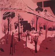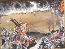 Even darker is Christopher Sweeney’s “7:30 Coal Pitch Drive” (right, 22 x 17 inches), which has a fun-house and the nightmare scariness of a decrepit honky-tonk carnival parading as a strip mall along a semi-deserted roadway. With agitated, deliberately unpleasant paint handling, the painting virtually shouts a dare–love me as I am with my dirty-looking surfaces and borrowed imagery.