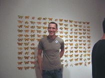 The installation has other parts–a grid of golden butterfly sculptures, some waxy, some glitter-coated, challenge Minimalism and Agnes Martin (who claims not to be a Minimalist). The symbolic fragility of life and ascending souls in multiples are such a different take on spirituality and mass production. The Catholic soul of da Corte wallows in decoration (left, da Corte in front of his butterfly grid).