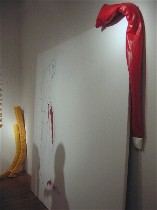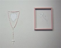As for da Corte, while his installation as a whole is a little fragmented, the individual items have loads of presence and content–a drooping ketchup squirter drapes over a life-sized drawing of himself squirting, intestinal red blood from his belly on a huge white canvas; mustard-color french fries with some intestinal droop lounge in a corner; a pink frame defines the edges of a wall painting of a white-on-white flower and a pink rosary frames a white, bloodless, radiant heart, sort of sweet pink girls turning Our Lady of the Little Flower and Sacred Heart into wall decorations (left, da Corte’s squiggly ketchup and fries).