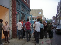 Twas the night before Live8, a First Friday in Old City, and the streets were pretty much deserted, everywhere except at Nexus, where you might think they were giving away ice cream cones or cold beer. Well, the beer really was a draw, but the main draw was “Nexus Selects,” a juried exhibition of recently graduated art school seniors and MFAs (left, crowd in front of Nexus).