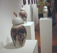 A series of clay pots named “Road Kill” by Marie Perrin-McGraw (from University of the Arts) plays on funeral urns and the tradition of plants and birds and other animals on pottery. Another grouping, “Farm,” is a series of cups each representing the farm animal painted on them. I thought the ideas were smart and hilarious, but the objects as things didn’t quite achieve the same level as the ideas (left, Perrin-McGraw’s “Road Kill” urns).