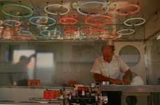 “Fallen Horse, Spain” and “Fallen Man, Paris,” two great Meyerowitz pictures from 1967, are mini essays about life, accidents and animal behavior. His “Danbury Fair, Connecticut,” (left) a shot of an elderly man working at the state fair, documents a time and place. But by framing the shot to show something odd (there’s a grid of round neon lights above the man’s head, making him look like he’s under a field of haloes), the artist provides some room for the viewer to weigh in. Is it a joke? What’s the joke? You decide.