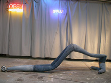 The gang put up a curtain to cordon off some of the space and it’s probably serendipitous but the curtain is so theatrical it’s the perfect backdrop Tristin Lowe‘s new piece, “Jean-nome,” a blue jeans inflatable (there’s a fan blowing air into the piece). “Jean-nome” is a perfect performer in front of the curtain. The ground-hugging piece is sly and demure. You almost don’t see it until you see it and then you can’t take your eyes off it.