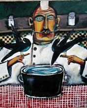 RFYour portraits are very edgy and intense. a lot of them seem to be you I think. They’re also a little like religious icons. Does religion play any part in them? Are you reacting against it maybe? I love them all but I am most intrigued by the one of the chef with two black birds on his fingers. Can you tell me a little about that one?