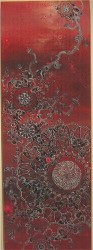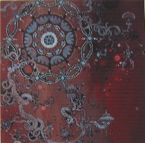 The background pulsates with peaceful waves of intensified color. The flower-jellyfish look for all the world like they belong in the world of Asian silk brocades and prints, not to mention wallpaper versions of those patterns. Bubbles and tentacles branch from the flowers, bathed in filtered light, looking for all the world like they could take a break from their beauty sleep and strangle anything that comes near (image, by Bell).The work is about decoration and style as much as it is about the eerie world it is describing or creating. The shapes of the longer, scroll-like lengths of some of the paintings only intensify the Asian references