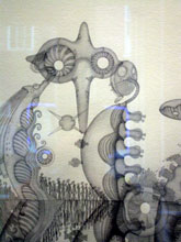 Kim’s diaphanous monochrome floating world of googly-eyed jellyfish that look like hot-air balloons and its armies of sea-polyp extra-terrestrials, all based on template shapes and curves, suggest a burgeoning of life-forms, a slightly weird and wonderful world of survival and procreation. It’s sexy in its joyous fantasy forms that create an underwater fairyland (right, a detail from one of Kim’s aqueaous fantasies).