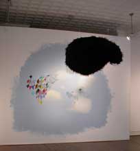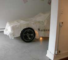 (image above is detail of Ruisenor’s paper car which includes a hideaway camping space inside of it and below is Gamble’s hairy cloud in front of her wall painting of the sky.)