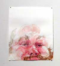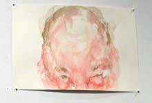 Brian Murphy‘s three lush and drippy self-portraits seem to quote from paintings and photos. They remind me of Jenny Saville’s lush self-portraits in oils. The focus on vulnerable pink flesh and the sketchy way the works drift off the page seemingly unfinished reminds you of watercolor’s days as sketches for a finished product.