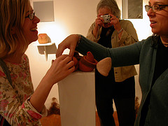 (The top image shows the two young artists enjoying art at Nexus. Click the image to see it bigger. That’s Libby snapping a picture. Next image is one of Es’s pin drawings (string wrapped around pins) and after that is one of Hoffman’s glove dolls (made with knitted gloves I believe).)