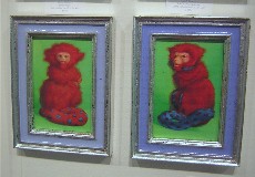 At Littlejohn Contemporary’s booth, the tiny (about 6 inches high) animal portraits from artist Laurie Hogin popped off the walls. Not only was this work funny, with colors that looked positively irradiated, but it was serious too, with themes of the human comedy, survival and lost species and other threats. I loved these monkeys as peppermint candies! I could hardly pick which ones to show you (above, “Field Guide to North America: Airwaves at Dusk,” and at the way top of the post, “Field Guide to North America: Monkey Pairs at Dusk”).