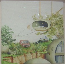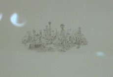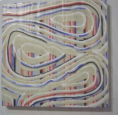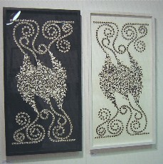 This work by Cranbrook artist-in-residence in sculpture Heather McGillis cut with a laser. The small pieces fall out and get glued on with hinges to make the positive image. The negative images uses the original sheet, with the cut-out spaces backed by contrasting paper. The tiny images are home and farm icons in wild profusion. Wow! (Roberta, excited by the work, was doubly excited when she realized she had met McGill on a visit to Cranbrook).