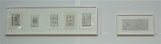 At Mixed Greens, we saw a variety of interesting work, including these sweet drawings of electrical outlets and an obsessively hatched envelope by Joan Linder (left, “Plugs,” and right, “Business”).