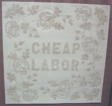 Another gallery that caught our eye was one we had visited at SCOPE last winter, Miller Block Gallery, which had a lot of works on paper on exhibit. Here’s a piece by Jane Masters, who burns paper to make her sampler-like sardonic social commentary (image, “Cheap Labor”).