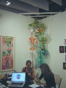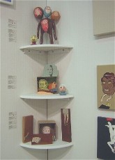 We also liked the Mark Mulroney work, including paintings and tiny sculptures with images glued or painted on (shown, on the top shelf a little three-headed doll that I wanted to hold called “Sweet Smoked Natural Style #1,” and lots more).