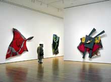 The jagged blue chasm painted in the middle is nothing compared to the muscular twists of the actual sculpted wood and canvas form which evokes tousled bedsheets and even a kind of undersea skate with a stinger for a tail.
