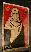 I got an advance peek at the prints on paper and wood, and was charmed. These are works quite unlike the “Obey Giant” posters and stickers which have a Western media-influenced feel with their high-contrast graphics and sans-serif typeface. The studio works, most dated 2005, have an old-fashioned socialist realist poster elegance instead, with baroque ornamentation and rich background designs suggestive of the patterning found in paper money.