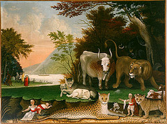 Happy day to all and an image from one of my all-time favorite artists, Pennsylvania homeboy, Edward Hicks, who never got enough of the lambs and lions lying down together and painted it different every time. This version of Hicks’s “Peaceable Kingdom,” circa 1848, is from the Albright-Knox Art Gallery.