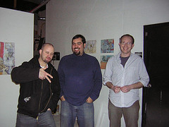 Turns out, the building is also full of artists studios. Here’s a picture of (left to right) Chris Sweeney, Mauro Zamora and Sam Faix in Sam’s studio. Mauro shares a space with Sam and Carolyn Hesse. And Sweeney’s studio is next door, shared with Ben Will and Todd Keyser.