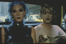 (image, Nan Goldin”s “Misty and Jimmy Paulette in a Taxi, NYC 1991.” I am unable to discern from Leeway’s jargon if these two would fall in the trans category. I know M and JP are transvestites, but do they identify as transgender, trans-sexual or genderqueer? Would they themselves have to call up Leeway or the William Way Center to sort out their Leeway gender identity?)In the interest of clarity, I’d like to propose that Leeway instead say “artists who identify as female as well as artists who were born female?” Simple. No jargon. Fewer categories. Clear. And more useful for people who feel their genders defy categorization.