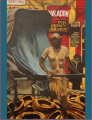 And speaking of New York City, a painting by New York artist Nitin Mukul of a rickshaw in New York City (yes, there really are bicycle-drawn ones, these days) amid piles of tires and advertising signs with a third-world, homemade look, was a highlight of his small exhibit at AAI of paintings and video, now on display. I also liked the shelter drill (we who dropped the bomb on Asia teaching our children what position to die in should Asia return the favor), and a triptych, Want Some Candy, of three men wearing Indian masks. The faces are photographic prints, but the cerulean sky is painted on, pulling the masks out of context and turning them into something menacing and leering. This is the transformation of the gods of Indian culture into the feared other of our national xenophobia.