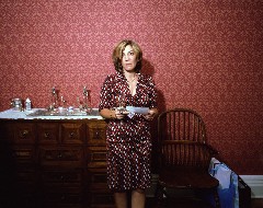 Stern’s “Cynthia,” in her red-patterned dress, standing in front of a sideboard topped with ritual silver candle sticks and havdalah set, a red-patterned wallpaper behind, seems less the subject than the patterns and the possessions. With her expensive hair streaks and conservative cut, it is the Jewish version of a Main Line matron, woven into the fabric of her life in such a way that it’s no longer her life but the life she was given.