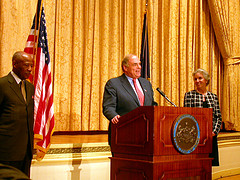 Governor Ed Rendell speaking at today’s press conference. Dr. Bernard Watson of the Barnes Foundation is at left and Rebecca Rimel of the Pew Trusts is right. Click picture to see it bigger.