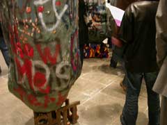 Our second reaction was so many people will not like this show — it’s difficult. This is a show that’s cruising the void of pop culture and finding there’s no there there. There aren’t many pretty pictures here or precious objects for your mantle or corporate atrium. It’s a show with angry art in it and grafitti and smashed walls and golden dildoes.