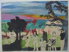 The drawings here range from representation to any number of something elses. I loved how Jessica Doyle’s untitled moms on a picnic with kids in tow, all looked distracted by the kids and absorbed with keeping things in control–a sort of anti-matter take on the old languid leisure-class portraits of Alex Katz or Fairfield Porter. Speaking of anti-matter, the people are merely black outlines, while the landscape behind them is a Fauve arcadia.
