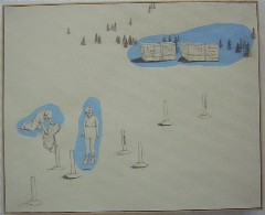 The only color in Emily Royer’s drawing of two kids playing near two boxy houses near the woods are sky-blue puddles of gouache surrounding the kids and the houses, auras of energy or memory that make the pencil marks immaterial and the space, well, spacy. What are those bollards sticking up near them? Landfill gas pipes? Or maybe those are troll chimneys from underground dwellings. The possibilities are numerous and creepy.