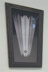 Part of what interested me in the exhibit, was the tension between the big lie and the big truth–or how art tells the truth by making up lies. That question of what is to be trusted is most obviously presented in the photo-based work, like John Schlesinger’s untitled inkjet print of a fluorescent light, the crazy angles of the frame reflecting the point of view from which the light was taken and looking a lot like my bad photographs of art in artblog. Even if you know the piece has no right angles, you certainly can’t tell from my photograph just what angles they might be. Roberta’s photograph here spells it out by offering some context.