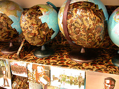 Image is detail of Thomas Hirschhorn’s Camo-Outgrowth (Winter), a new acquisition at the PMA that is a stellar attraction of the Energy Yes! installation. The camouflage tape seems to cover tumors that have cropped up on the globes. The whole thing conveys a kind of aesthetic of illness and bandaging in an on-going story that is told new each day. Click image to see it bigger.