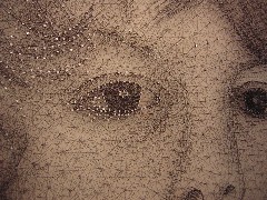 Even traditional drawing makes it into fiber art, exemplified by Kim Kamens’ Max. The nail heads rescue what would otherwise be just an exercise in technique. In the same vein were Shisuzko Kimura’s airy croquis in needle and thread.