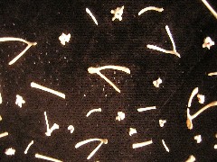 detail of Best Wishes by Amy Orr, at the Painted Bride, bleached chicken bones and beads on velvet; Orr stated that the bones series was an outgrowth of 9/11. What I like is the way the beads and bones look like constellations in the night sky.
