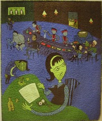 Cartoon and wit also turned up at the Philadelphia Art Alliance where the official theme was communication. Fortunately, artists will be artists and not comply. I loved witty Whine and Dine at Sushi Zen from Pam RuBert of Springfield, Mo. The stitching and material choices are meticulous and beautiful. The piece communicated just fine with its slice of contemporary life cartoon that would look swell on a New Yorker cover.