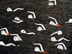 Jen Corace‘s “Swept out to Sea” at Art Star is a haiku of an exhibit. The 26 small and elegant watercolor paintings sprawl across the walls in poetic cadences and tell of a watery world both dark and cool, where the flipside of a nice day at the beach is flooding, shipwreck and death. Corace, a South Jersey native who lives in Providence, R.I., is a freelance illustrator whose paintings are pristine and narrative. Her figures remind me of some Japanese children’s books where eyes are wide-set and faces emotion-free.