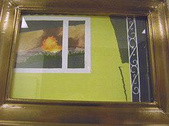 Some of the paintings included windows looking in, suggesting not just a reflection of natural disasters but also a vision into the truth of households–not so safe. The sunlit suburban aluminum siding with sharp, dark shadows in Catastrophic Insurance questions the safety of the suburban dream. The image is destabilized not just by the explosive window scene, but by the angle and the composition, the bulk of the painting surprisingly focusing on the siding.