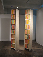 The “books” suggest left-wing thinking, right-wing thinking, social movements, chapters from the past–Our Town, All the President’s Men, On the Road, The Plot Against America. At first I thought the two towers–The Complete History of the USA, Versions 1 and 2–stood for different political positions or world views, but as I read title after title, I realized they couldn’t really be pigeonholed into liberal versus conservative. The diversity of views and the American self-image seem to be the point.