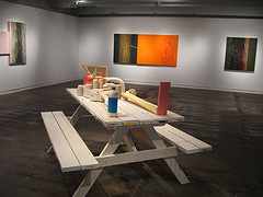 Isaac Resnikoff’s picnic table looks just right in this hot weather, center stage at Fleisher/Ollman Gallery, part of a three-man show that also includes Anda Dubinskis and Mark Khaisman.