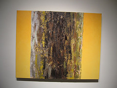 The work has a clear feminist bent, the world around the trees painted in flat, decorative wall colors like pinks, peaches and yellows. It’s by Jill’s leave that Jack gets to stand in the world she has painted. My favorites were the roughest of the barks, their colors illuminated as if from a nearby forest fire.